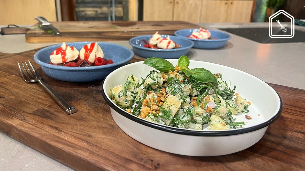 Het menu bestaat uit drie onderdelen. We beginnen met de aardappelsalade met zeekraal en verderop vind je de benodigdheden en bereidingswijze van de meringue met fruitsalade en frambozensaus. Hoe je die frambozensaus zelf maakt vind je onderaan deze pagina.