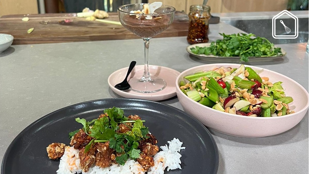 Het menu bestaat uit drie onderdelen. We beginnen met de crispy tempeh in pinda-kokossaus en verderop in het artikel vind je de benodigdheden en bereidingswijze van de bleekselderij en de chocolademousse met kokoskaramel. Veel kookplezier!